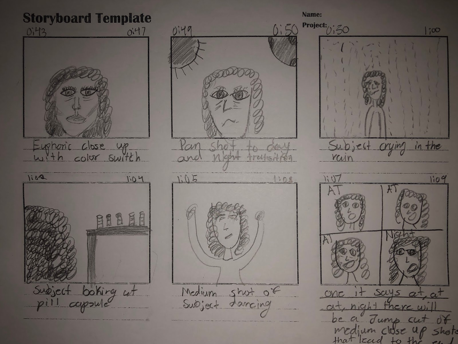 That will become scene fives part, seconds forty to forty-two will be a close-up dutch shot of the subject falling backward which will be the transition of the next scene. Scene six, seconds forty-three to forty-four will be the subject in the bed sitting up. Scene seven, seconds forty-five to forty-seven will be a small pan of the subjects close-up. Scene eight, seconds forty-nine to fifty will be a close-up of the subject standing during the day and night showing how everything feels the same every day, all the time. Scene nine, seconds fifty to 60 or one minutes will be the subject standing in rain crying. Scene ten, minute 1:01 to 1:04 will be the subject over the shoulder shot looking at orange pill capsules. Scene eleven, minutes 1:05 to 1:08 is a medium shot of the subject dancing around finally being happy. Scene twelve, minutes 1:08-1:09 will be multiple jump shots of a close up of the subject's facial expressions. Scene thirteen will be the title of the song with the names of my partner and I.